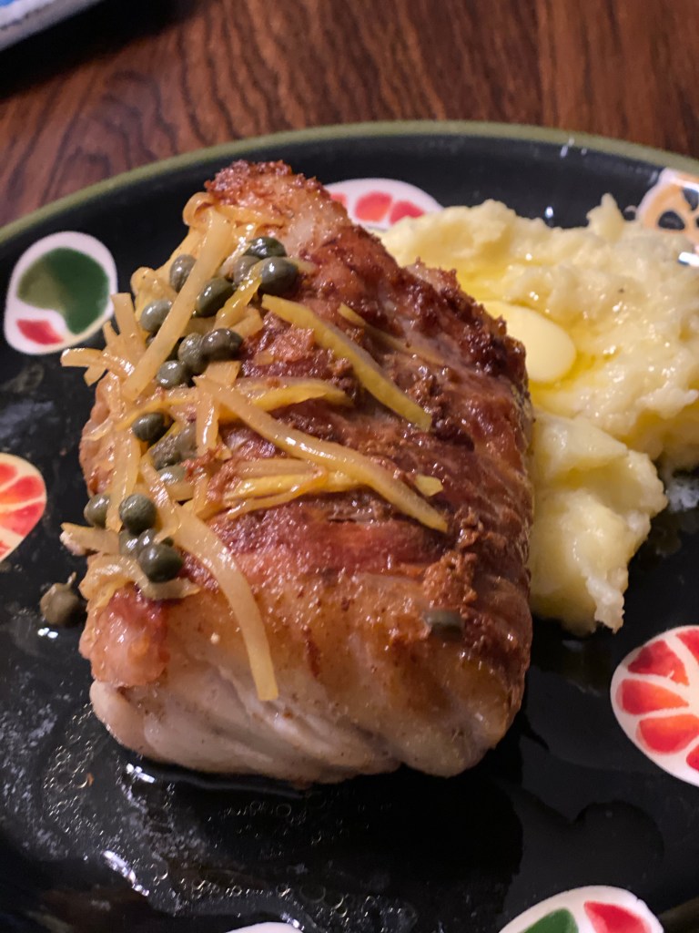 Prosciutto wrapped Monkfish with Preserved Lemon, Fried Capers, & Brown Butter