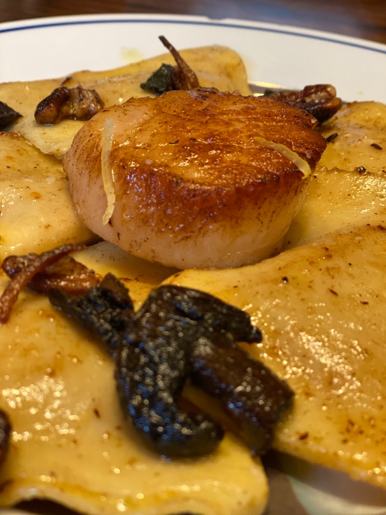 Squash season is simply one of my favorites. It brings me back to my mother baking halved & cleaned acorn squash with butter, cinnamon, brown sugar, & marshmallows. Butternut squash is very versatile as well. Wether a creamy rich decadent soup, rissotto, or ragu with mushrooms it always warms the heart & soul. Here we did homemade ravioli with brown butter, fresh sage, & pecans and kicked it up a notch by adding a U10 scallop with preserved lemon.