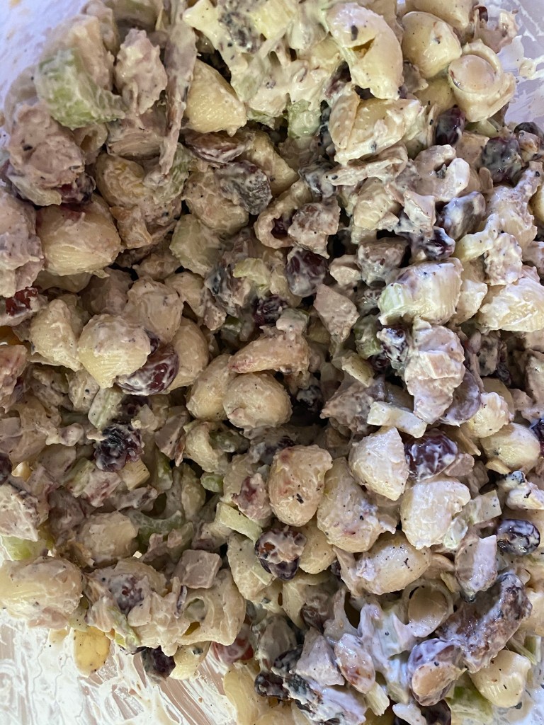 One of my favorite summer foods is a chilled chicken salad. So easy & versatile. Whether you choose to grill, smoke, or roast your chicken you can add your choice of favorite veggies (bell peppers & celery are our staples) a hint of sweetness with grapes, craisins, raisins, apples, etc and added texture and crunch with sliced roasted almonds, walnuts, pinenuts, etc. I usually make it mayo based and throw in some fresh herbs for a fresh kick or basil pesto in this version. All of it mixed with your favorite pasta or grain makes it a great 1 bowl meal or snack. Other popular versions are dill, chipotle, orange, or siracha.